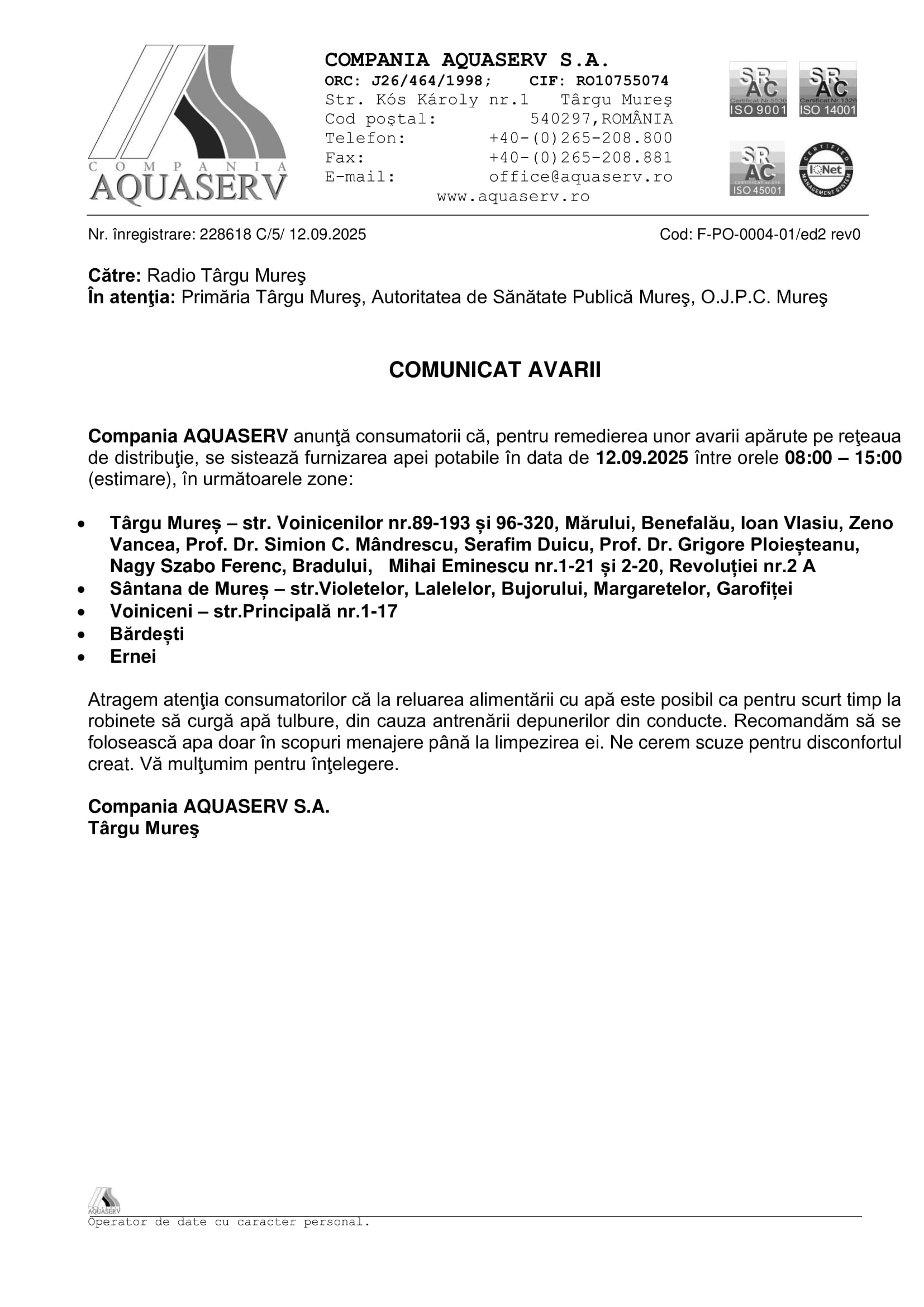 Mâine, 2 septembrie 2025, din cauza unei avarii la rețeaua de distribuție a apei potabile, în centrul comunei Sântana de Mureș se va întrerupe furnizarea apei în intervalul orar 08:30 – 12:30 (estimativ).