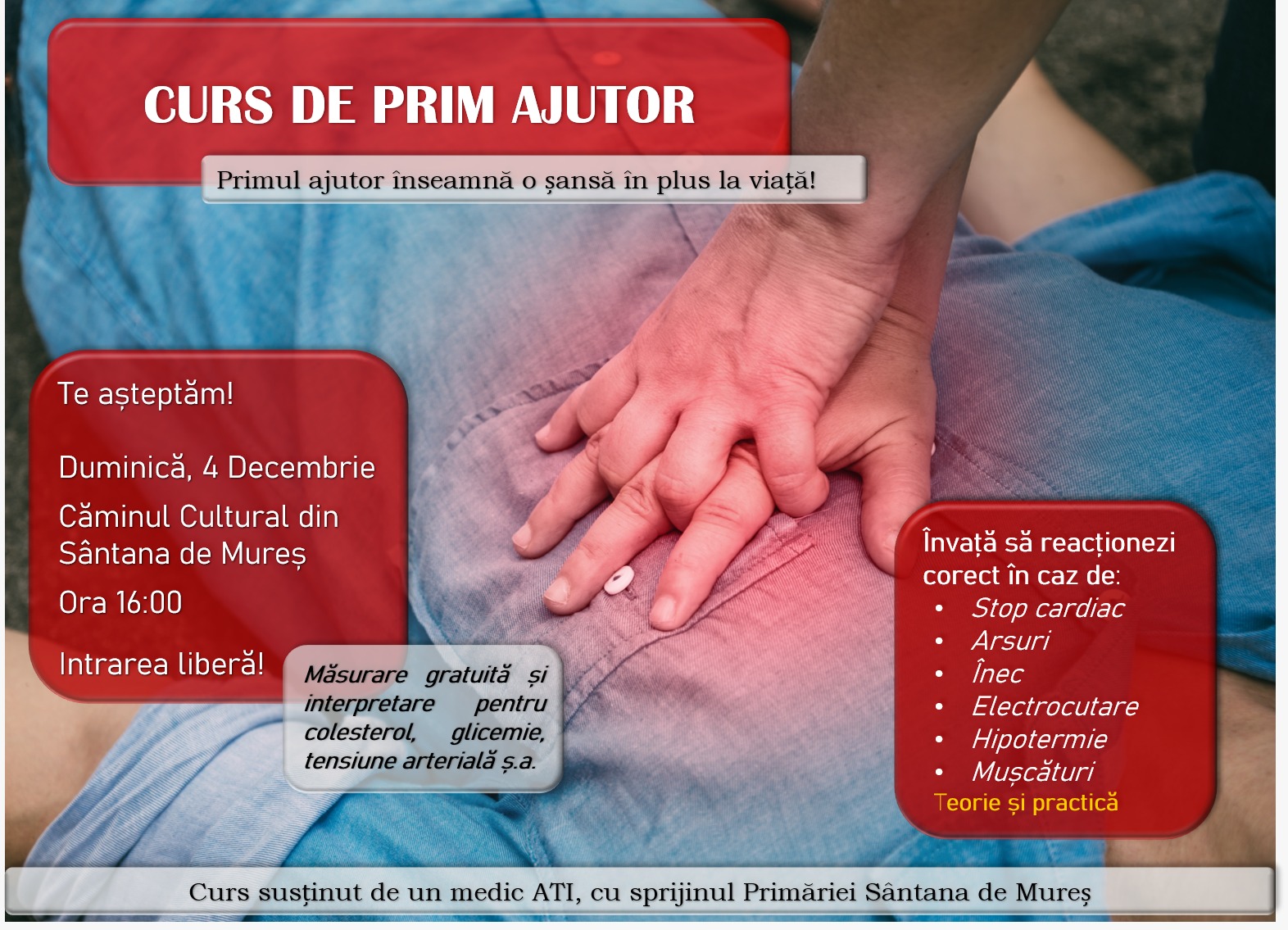 Primul ajutor înseamnă o șansă în plus la viață! Vă așteptăm duminică, 4 decembrie începând cu ora 16:00, la cursul de prim ajutor organizat la Căminul Cultural din Sântana de Mureș. Intrarea este gratuită pentru toți locuitorii comunei.