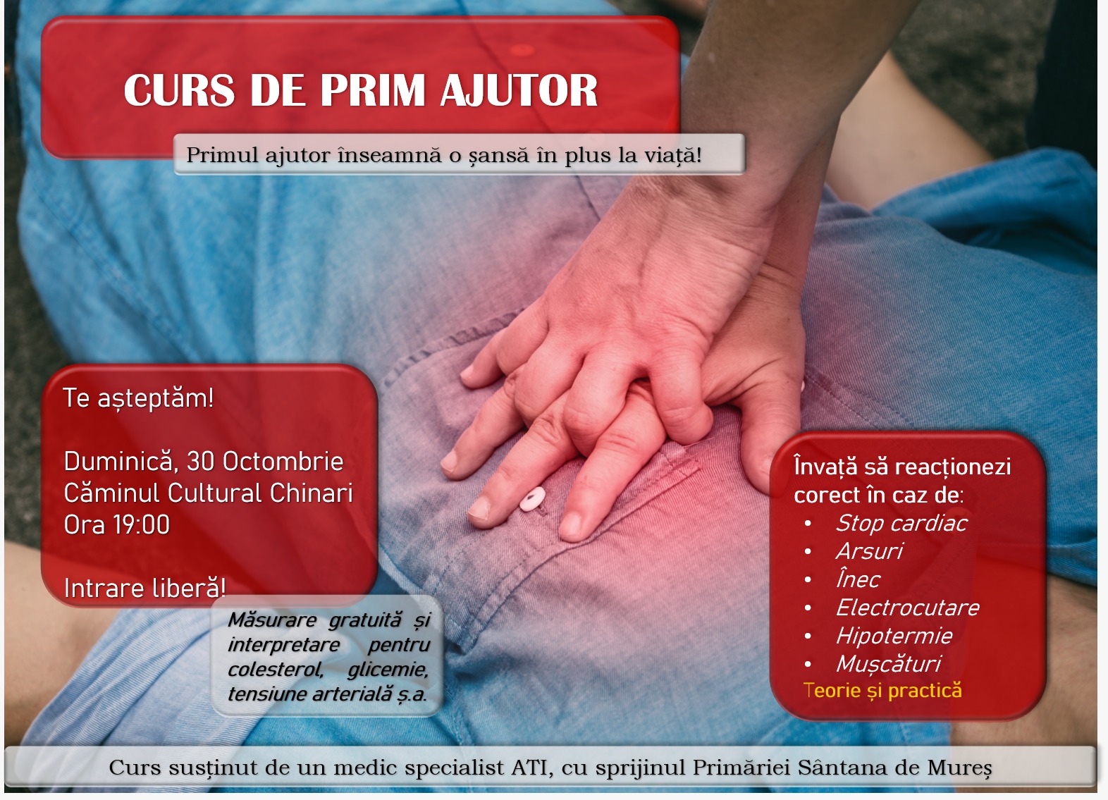 Primul ajutor înseamnă o șansă în plus la viață! Vă așteptăm duminică, 30 octombrie începând cu ora 19:00, la cursul de prim ajutor organizat la Căminul Cultural Chinari. Intrarea este gratuită pentru toți locuitorii comunei.