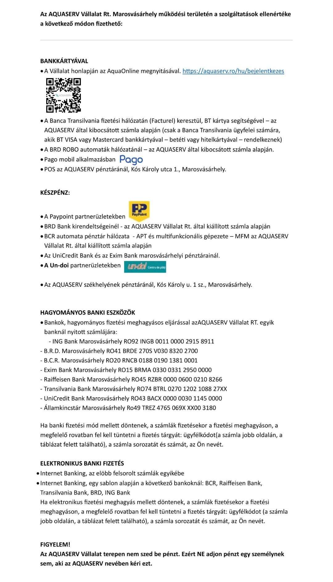 Având în vedere preluarea furnizării apei potabile direct de către AQUASERV și numeroasele întrebări primite din partea cetățenilor, vă aducem la cunoștință informațiile oficiale transmise de AQUASERV S.A. privind modalitățile de plată a serviciilor de apă potabilă.