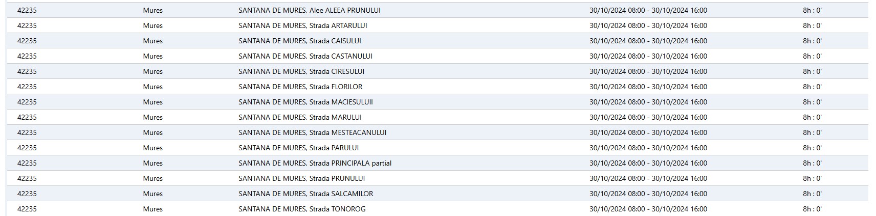 Vă informăm că în cursul zilei de 30.10.2024, în intervalul orar 08:00-16:00, se întrerupe curentul electric în Comuna Sântana de Mureș, sat Sântana de Mureș, pe următoarele strazi afișate în imagine.