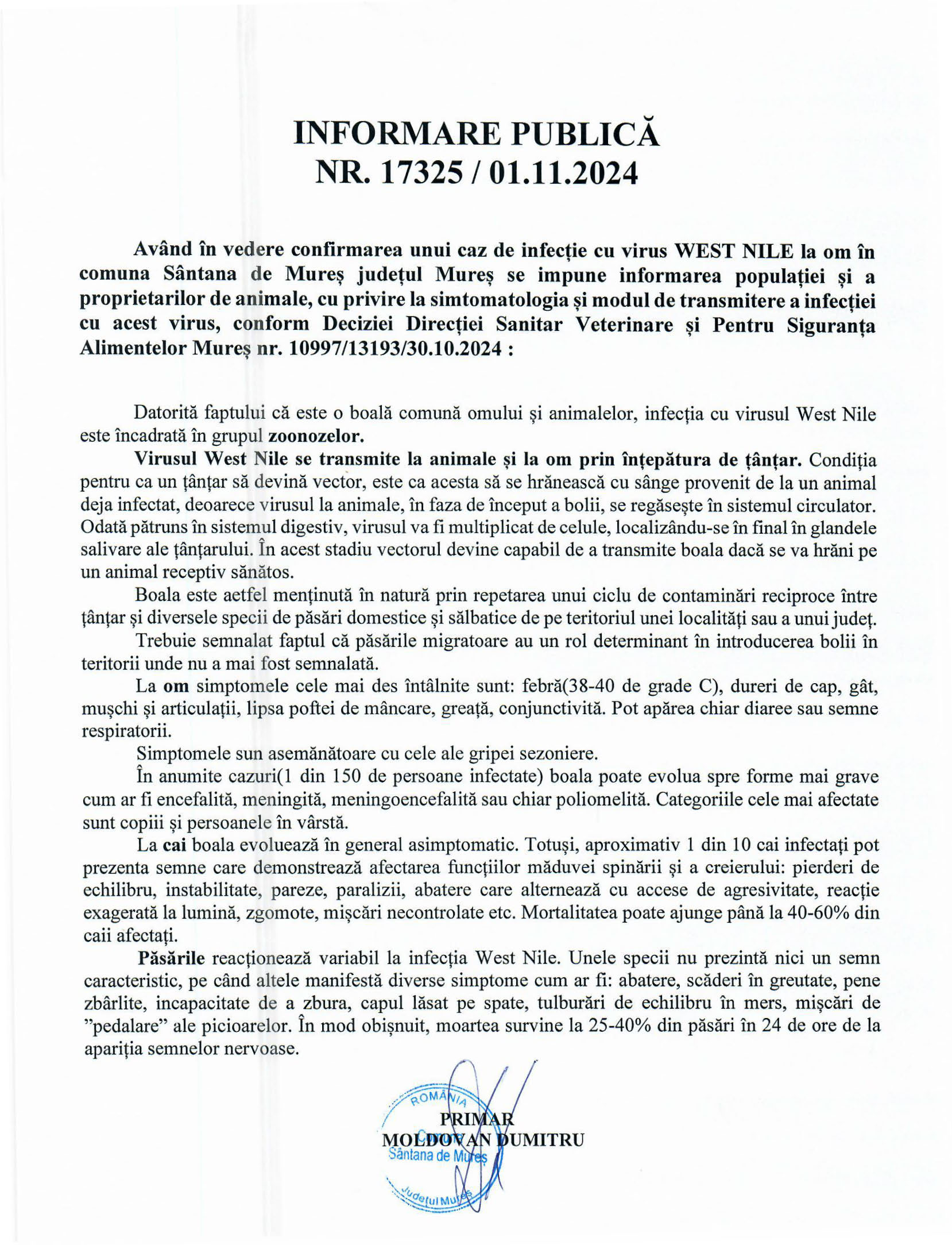 Vă anunțăm că din cauza unei avarii, apa potabilă se întrerupe în data de 1 noiembrie, în Sântana de Mureș, de la strada Cimitirului spre Curteni, Curteni (întreaga localitate) și Chinari (întreaga localitate) în intervalul orar 09:00 – 15:00 (estimare).