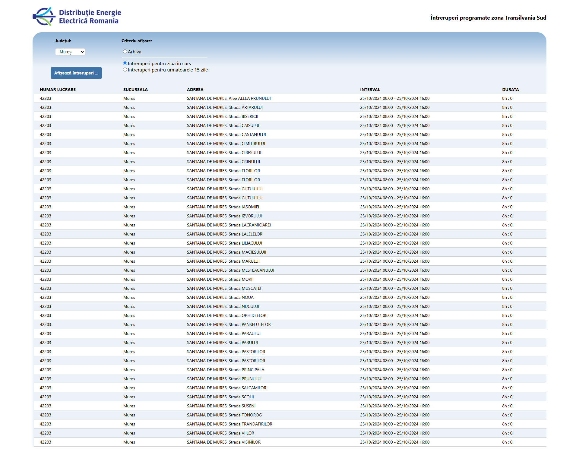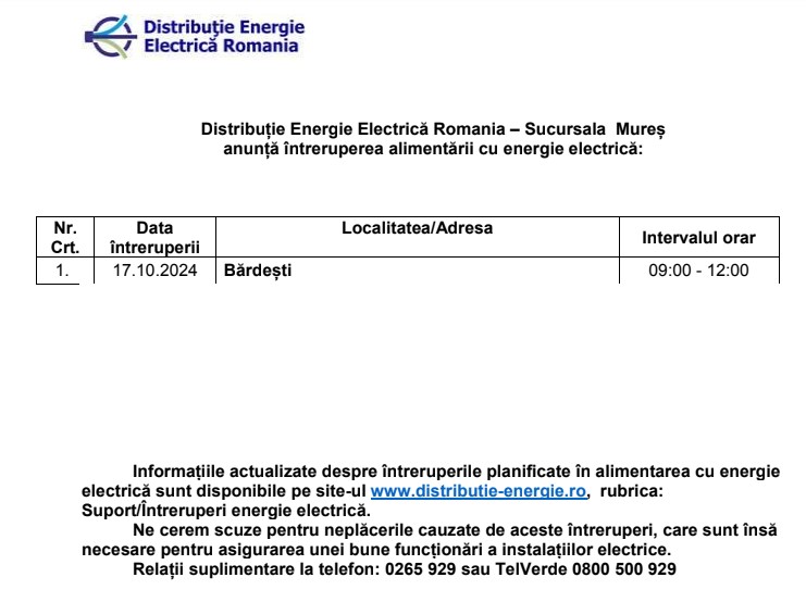Dorim să menționăm faptul că Primăria Sântana de Mureș nu a fost anunțată de aceste întreruperi pentru a putea anunța locuitorii în timp util. Aceste informații au fost preluate de pe site-ul operatorului de distribuție a energiei electrice.